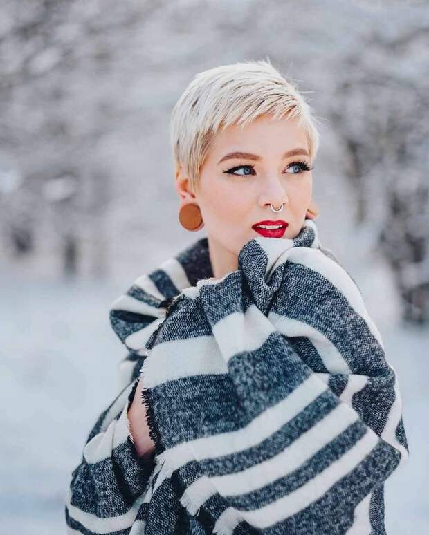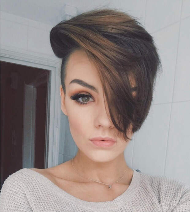 Укороченная, дерзкая челка – это выбор активных и стильных дам в 2022 году. Подходит вариант далеко не всем девушкам, так как главная особенность – это максимально открытый вид. Но даже это не пугает милых леди, такую челку очень любят зрелые женщины, которые выбирают для себя модную ультракороткою пикси. Укладывают ее не только в естественном прямом виде, но и брутально убирают наверх.