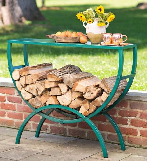 Совместите приятное с полезным. Оригинальный столик станет вашим компаньоном к утренней чашке кофе, а его нижний ярус заботливо спрячет от дождя запас дров.