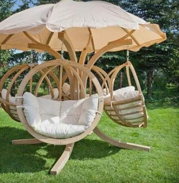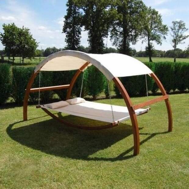 Как приятно в летний полдень вздремнуть на свежем воздухе. От полуденного зноя защитит кровать, совмещенная с качелью. Самое сложное будет встать, когда проснешься.