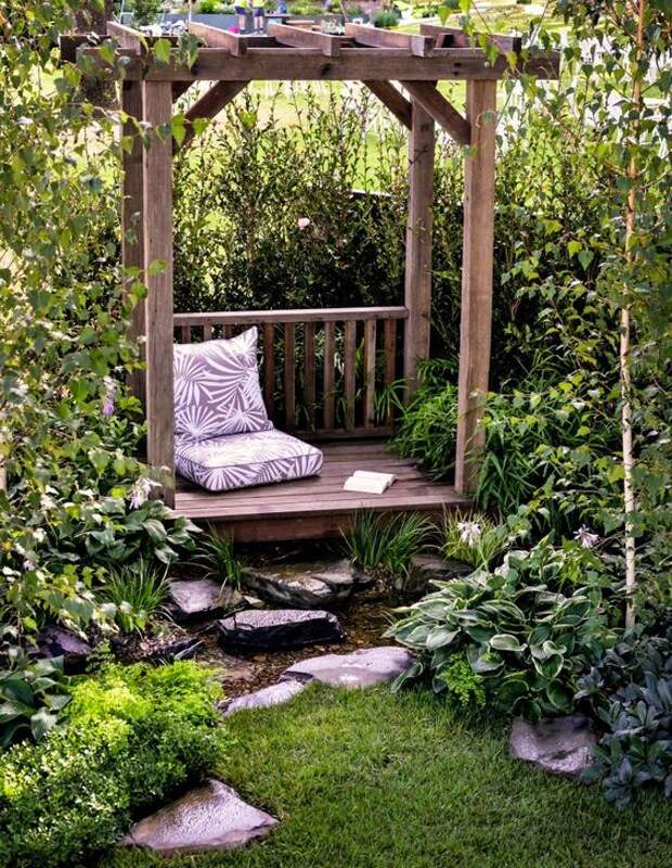 Одно или несколько деревьев создадут уютный и тенистый уголок для беззаботного отдыха. Поместите под кроной платформу из досок, разложите подушки и плед. Место для чтения и сна готово.