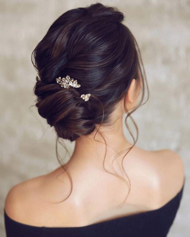 Для вечернего варианта прически собранный объемный пучок декорируют шпильками или невидимками со стразами или жемчужинами на конце.