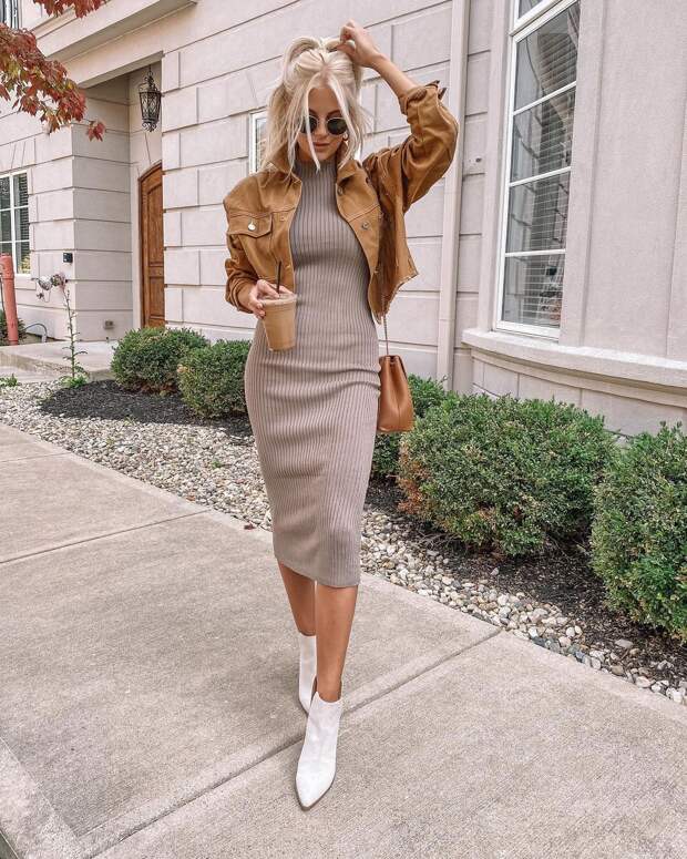 При желании с кожанкой и полуботинками собирают женственный образ. Кожаная куртка в классической модели, полуботинки на каблуке или на небольшой не сильно грубой платформе отлично смотрятся с платьем из трикотажа в облегающей модели.