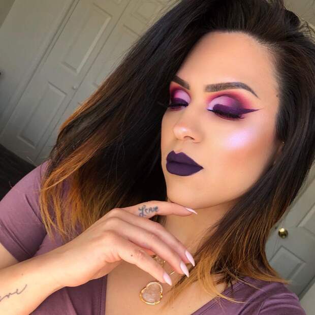 Особенно роскошно смотрится баклажановый темный оттенок у обладательниц черных волос. Благодаря тону помады женщина сможет выразить свой темный цвет волос. Для помады цвета баклажан стоит украсить свои глаза стильными стрелками.