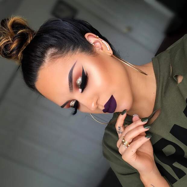 С помощью помады с тоном спелая слива создается очень интересный и интригующий макияж. Цвет отлично подходит как брюнеткам, так и блондинкам. Глаза можно выразить любимыми стрелками, серым или нюдовым макияжем.