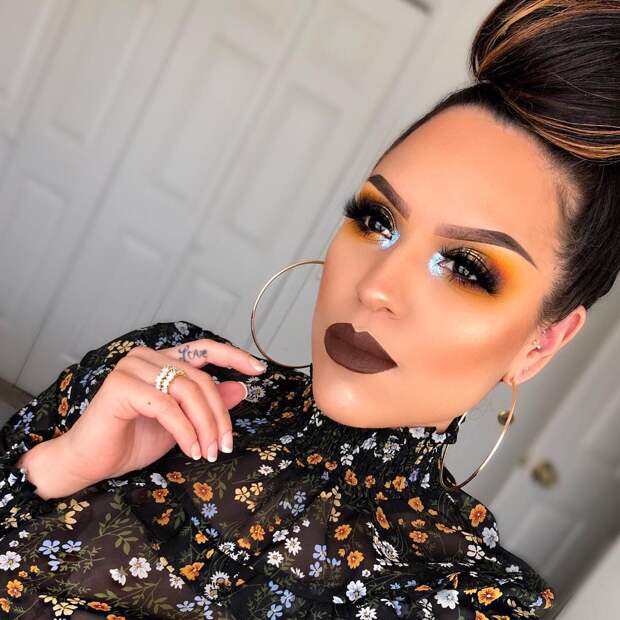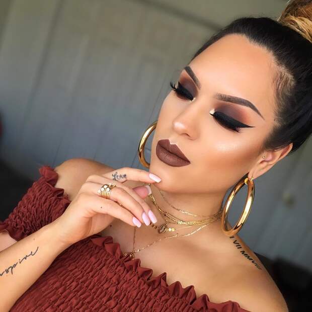 К помаде коричневого цвета легче всего подобрать макияж. Для такого тона губ можно выбрать практически любой мейкап со стрелками, с коричневыми тенями и ярко выраженными ресницами.