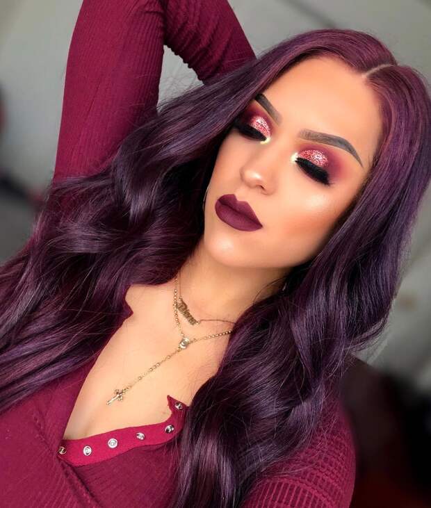 Насыщенный винный цвет лучше всего подходит прекрасным брюнеткам. Такой цвет смотрится гармонично со спокойным макияжем. Идеальный вариант – нюдовый мейкап.